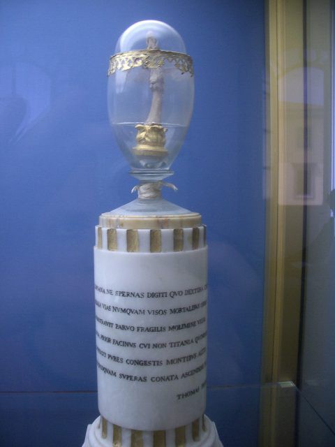 Trông hơi đáng sợ, ngón tay giữa (bàn tay phải) của Galileo được đựng trong một hộp kính hình quả trứng, bên dưới có bệ đá cẩm thạch