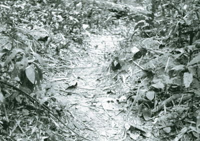 Quan sát về phía Đông của đường mòn thấy xa hơn khoảng 200 thước thì con đường đi xuống thấp dần, vì đường mòn chạy theo triền đồi thoai thoải xuống. Vừa định lấy máy hình ra chụp, tôi bỗng nghe có tiếng ồn ào về hướng Tây. Vội thụt lui vào phía trong thì đã thấy một đoàn người vừa xuất hiện ở khúc quanh con đường. Dẫn đầu là một tên quần xanh, áo trận vàng, đầu đội nón cối, tay cầm một cây gậy dài, vai quàng một miếng vải dù bông, vừa chạy vừa hô: ”Khẩn trương – Khẩn trương – Khẩn trương”. Phía sau là một đoàn người gần như chạy lúp xúp mặc đồ trận xanh, nón cối, giầy vải, khiêng những khúc dài được bọc bằng giấy mầu ô-liu, không biế là sơn pháo hay phòng không. Có tên gánh, có khi cả 2 tên khiêng một thùng gỗ hoặc thùng sắt. Tôi đứng như trời trồng vì chỉ cách chúng không đầy 5 thước! Bờ suối thì cũng cách tôi khoảng chừng 5 thước.