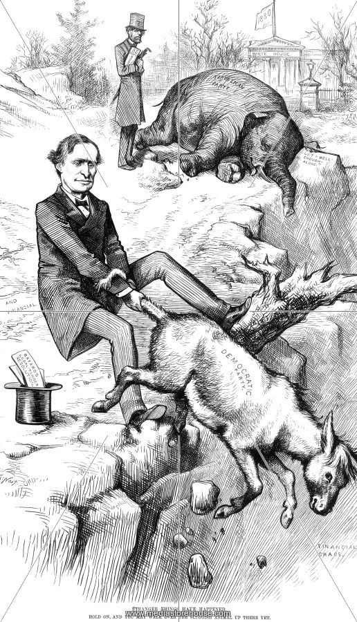 Hình ảnh "con lừa" của ông Nast cũng không khá hơn. Trong một bức tranh năm 1879, ông Nast vẽ con lừa sắp ngã xuống vực sâu của "khủng hoảng tài chính".