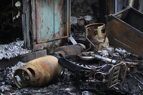 Bình gas nằm lăn lóc cùng xe máy cháy rụi ngoài hiên quán cà phê. Ảnh: Gia Chính