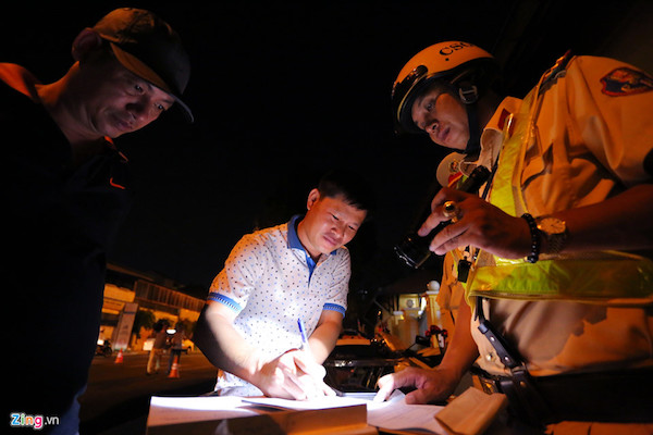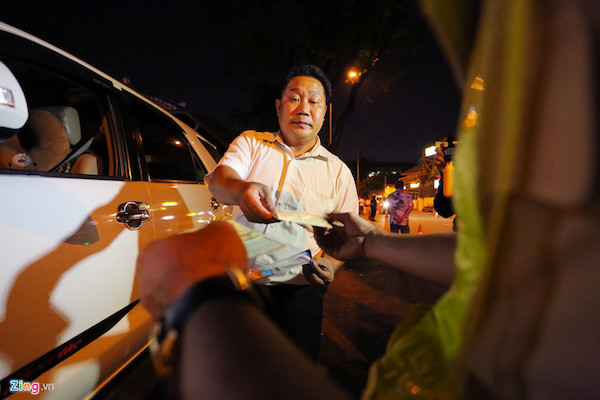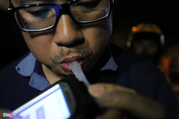 Trên đường đi nhậu về, anh Phạm Văn Diên (40 tuổi, quê Thái Bình) được lực lượng CSGT yêu cầu kiểm tra nồng độ cồn. Sau khi anh thổi vào máy, chỉ số thể hiện 1,393 mg/ lít khí thở, tài xế vi phạm nghiêm trọng luật giao thông đường bộ. Anh bị lập biên bản, giữ xe và hẹn lên Đội CSGT Bàn Cờ làm việc. "Tối nay ngồi với bạn bè vui quá, tôi uống khoảng 10 chai bia, nhưng vẫn tỉnh táo lái xe về nhà. CSGT thông báo mức phạt của tôi là 17 triệu đồng. Tôi hoàn toàn chấp hành, không ý kiến gì cả", anh Diên nói.