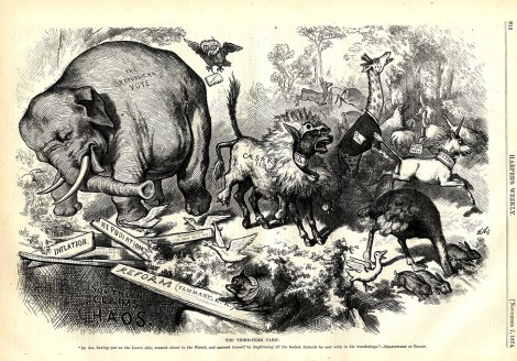 Ông Nast khi đó đã vẽ báo New York Herald là một con cừu được bọc trong lớp da sư tử, dọa các loài động vật khác bằng những lời đồn về ông Grant. Trong số đó có một con voi rất lớn trên mình ghi dòng chữ "lá phiếu đảng Cộng hòa" trông như sắp ngã xuống vách đá gần đó.