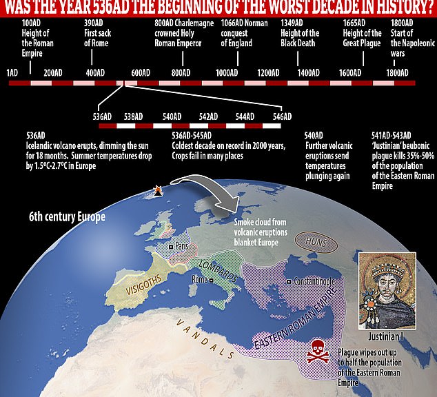 Các nhà nghiên cứu đã kết luận đây là thời kỳ đen tối nhất lịch sử. Đó là năm 536. Thời kỳ này bệnh dịch, nạn đói, chiến tranh, khí hậu khắc nghiệt, tất cả đều diễn ra trong một thời điểm.