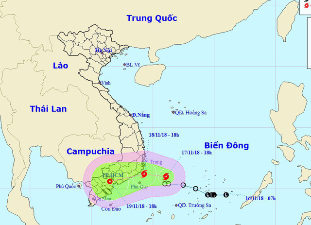 Dự báo trong 24 giờ tới, bão di chuyển theo hướng Tây, mỗi giờ đi được khoảng 10km. Đến 19h ngày 18/11, vị trí tâm bão ở khoảng 11,2 độ Vĩ Bắc; 109,3 độ Kinh Đông, ngay trên vùng biển các tỉnh từ Ninh Thuận đến Bà Rịa-Vũng Tàu. Sức gió mạnh nhất vùng gần tâm bão mạnh cấp 8 (60-75km/giờ), giật cấp 10. Bán kính gió mạnh cấp 6, giật cấp 8 khoảng 120km tính từ tâm bão.