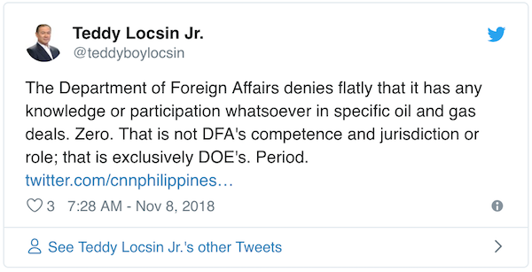 Ngoại trưởng Teodoro “Teddyboy” Locsin Jr đã tuyên bố trong một bài đăng trên Twitter vào ngày 8/11: “Bộ Ngoại giao bác bỏ thẳng thừng rằng Bộ có bất kỳ thông tin nào hoặc có tham gia vào bất kỳ giao dịch dầu khí cụ thể nào. Hoàn toàn là không.” Ông nói rằng đây không phải là thẩm quyền của Bộ Ngoại giao (DFA), vì điều này là lĩnh vực “độc quyền” của Bộ Năng lượng (DOE).