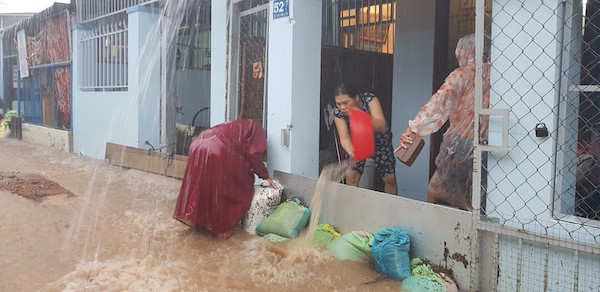 Nhiều gia đình phải gia cố nhà cửa, chèn bao tải cát để chống nước vào nhà. Tuy nhiên do nước quá lớn khiến một số gia đình ở khu vực trũng thấp bị ngập - Ảnh: Báo Khánh Hoà.