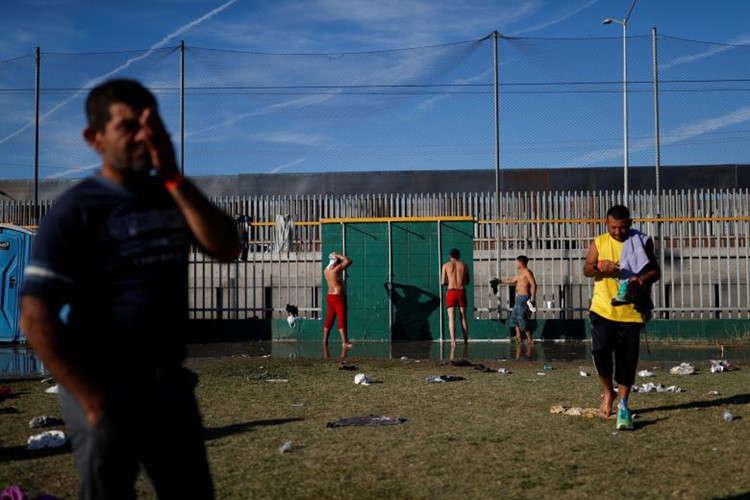 Những người dân nhập cư tắm giặt ngay cạnh bức tường biên giới Mỹ-Mexico ngày 17/11. Họ sống trong một trung tâm thể thao hiện được sử dụng làm nơi trú ẩn tạm thời cho di dân ở Tijuana.