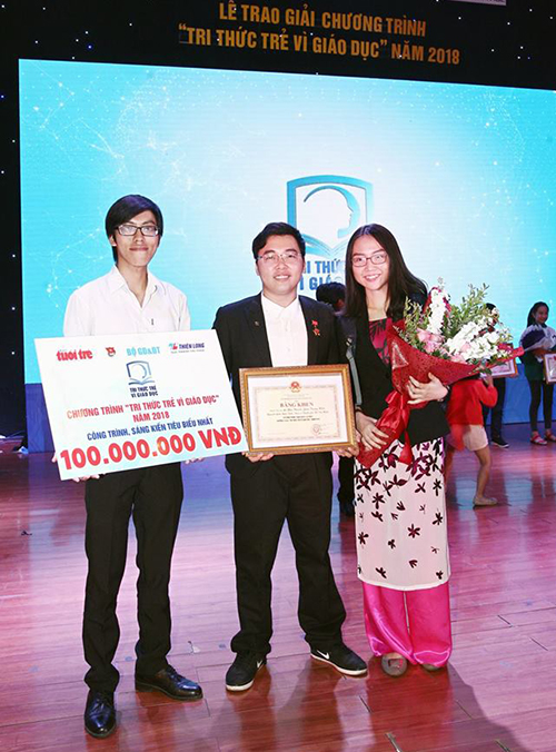 Thanh cùng nhóm bạn được trao giải thưởng trong chương trình "Tri thức trẻ vì giáo dục".