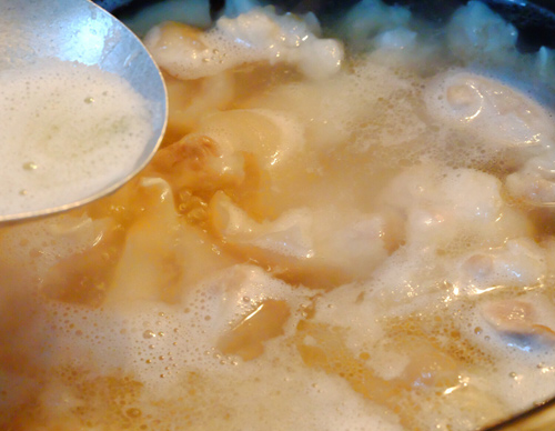 Bước 6: Thịt xào sơ rồi cho vào nồi để nấu. Chú ý đổ nước ngập mặt thịt, nước sôi phải hớt bọt cho thật sạch như vậy món thịt đông mới trong không bị đục.