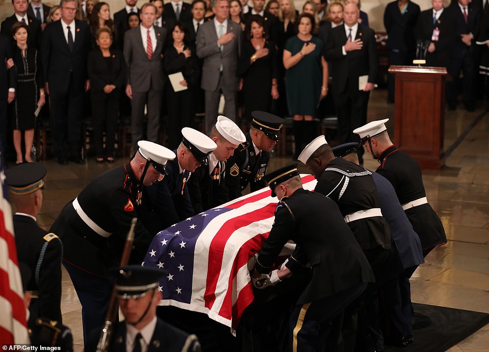 Phó Tổng thống Pence, cựu Tổng thống George W. Bush, cựu đệ nhất phu nhân Laura Bush, và cựu Thống đốc bang Florida, Jeb Bush tham dự lễ viếng.
