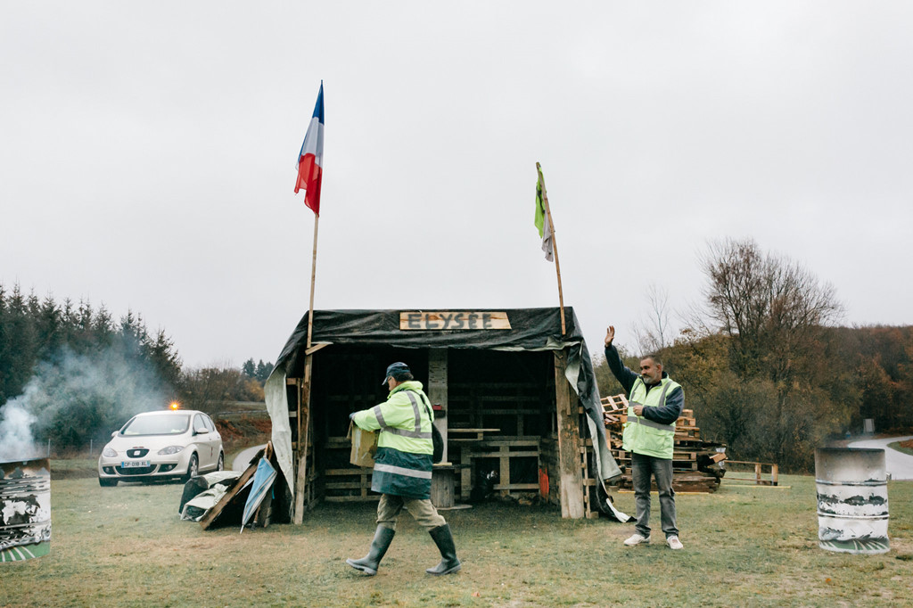 Để tham gia vào cuộc biểu tình, anh Dou và nhiều người khác đợi từ lúc trời tối ở giữa bùng binh, trong trời mưa, lạnh và bùn ở căn lều bạt dựng tạm. Trên một chiếc lều có dòng chữ “Élysée của nhân dân”, mỉa mai Điện Élysée, nơi Tổng thống Macron đang làm chủ. “Macron, ông ta đi với những ông chủ lớn. Macron, ông ta quay lưng với người dân”, một ca sĩ hát trên radio.
