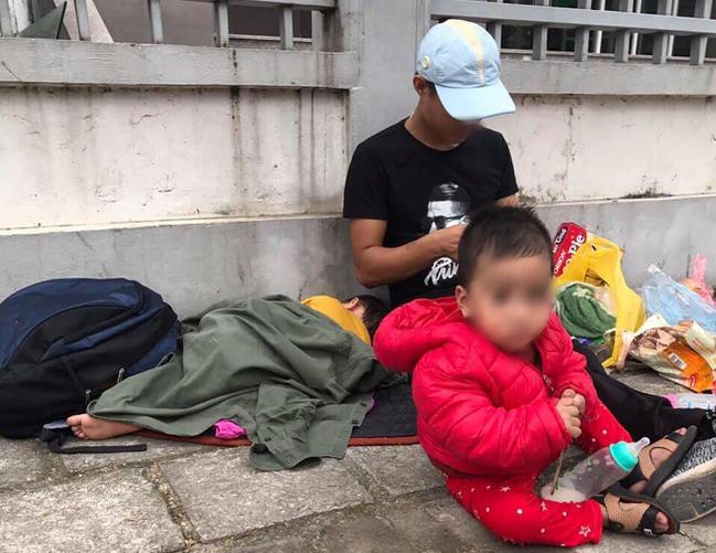 Anh M. ôm hai con nhỏ ngồi vạ vật ở vỉa hè để tìm vợ.