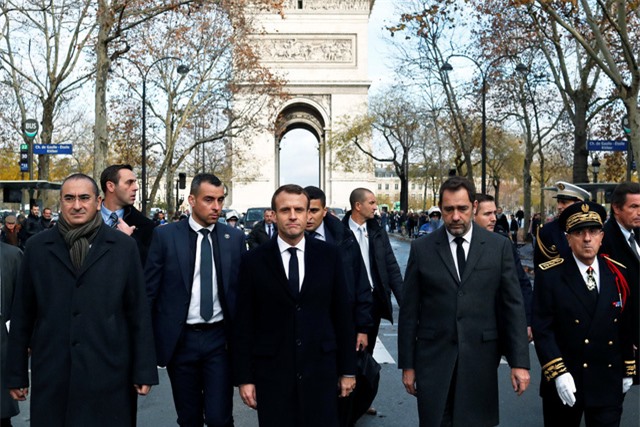 Tổng thống Macron (giữa) cùng các quan chức Pháp thăm khu vực xảy ra biểu tình ở Paris hôm 2/12. (Ảnh: Reuters)
