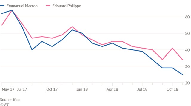 Biểu đồ thể hiện tỷ lệ ủng hộ ngày càng sụt giảm của Tổng thống Emmanuel Macron và Thủ tướng Edouard Philippe từ tháng 5/2017 - thời điểm ông Macron đắc cử tổng thống Pháp. (Nguồn: FT)