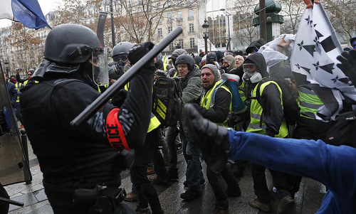Cảnh sát đụng độ người biểu tình ở Paris hôm 8/12. Ảnh: AP.