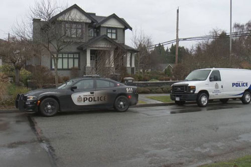 Xe cảnh sát trước ngôi nhà của vợ chồng bà Mạnh tại Vancouver. Ảnh: GlobalNews.