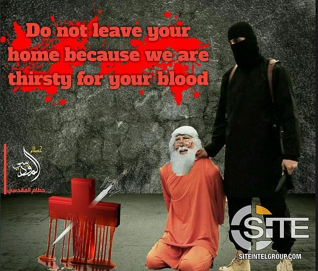 Một ngày trước, IS còn tung ảnh ghép, trong đó ông già Noel quỳ trước tay súng bịt mặt. Bức ảnh kèm theo lời khuyến khích những kẻ ủng hộ thực hiện các vụ tấn công theo kiểu “sói đơn độc” trong dịp Giáng sinh năm nay.