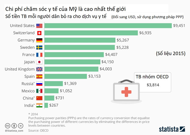 Theo số liệu của Statista, số tiền mỗi người Mỹ chi trả cho các dịch vụ y tế là cao nhất trên thế giới và từ lâu đã có nhiều ý kiến cho rằng hệ thống chăm sóc y tế của nước này cần phải được cải cách.