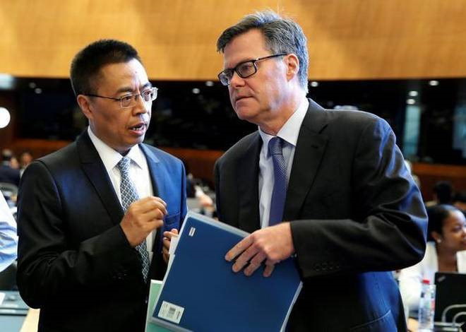 Phó đại sứ Trung Quốc tại WTO Zhang Xiangchen và Đại sứ Mỹ tại WTO Dennis Shea tranh luận bên lề cuộc họp. Ảnh: Getty.