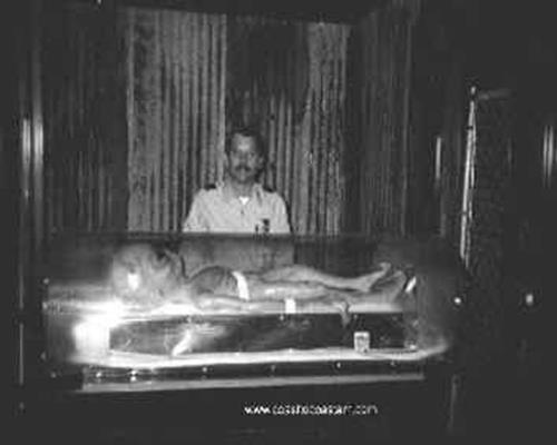 Louis Caparat chụp bên chiếc quan tài thủy tinh chứa di thể mà ông tin là người ngoài hành tinh. (Ảnh: storage.canalblog)