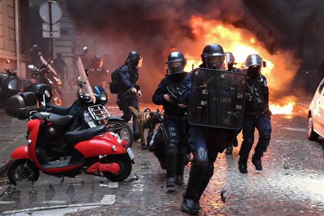Cảnh sát được triển khai đối phó với người biểu tình "Áo vàng" gây bạo loạn tại Paris, Pháp ngày 8/12/2018. (Ảnh: THX/TTXVN)