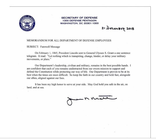 Trong một thông điệp chia tay được công bố vào ngày 31/12, ngày tại vị cuối cùng, Bộ trưởng Mattis đã trích dẫn một bức điện mà cố Tổng thống Abraham Lincoln từng gửi cho Tướng Ulysses S. Grant vào ngày 1/2/1865 trong những tuần cuối cùng của cuộc Nội chiến.