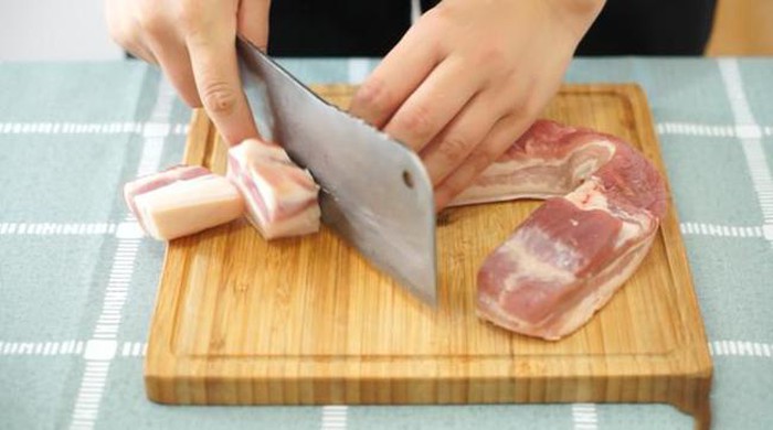 – Bước 1: Ba chỉ rửa sạch, thái miếng dày. Sau đó đổ nước lạnh vào nồi, thêm thịt lợn, luộc sôi 3 phút cho sạch hết bọt bẩn. Rồi đổ thịt ra ngoài, rửa sạch lại với nước ấm, để thịt ráo.