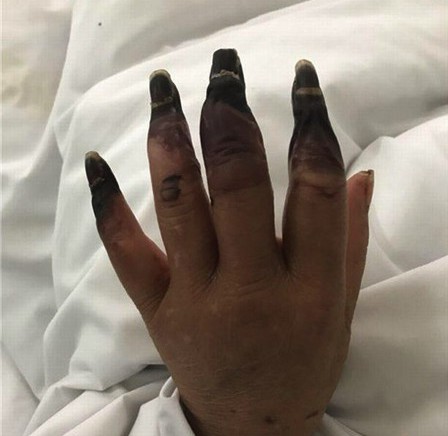Cuối cùng, các ngón tay cô Zhang cũng biến thành một màu đen xì như than cháy. Không chỉ ở quanh vết thương mà cả tay trái rồi tay phải, cả 8 ngón tay trên hai bàn tay đều đổi màu, chỉ ngoại trừ có ngón cái của bàn tay trái và ngón áp út của bàn tay phải.Đến lúc này, cô Zhang mới vội vàng tới bệnh viện khám xét. Tuy nhiên, chứng hoại tử đã khiến hai tay của người phụ nữ 53 tuổi bị ngứa, khô, đau và cuối cùng là dần dần tê liệt.