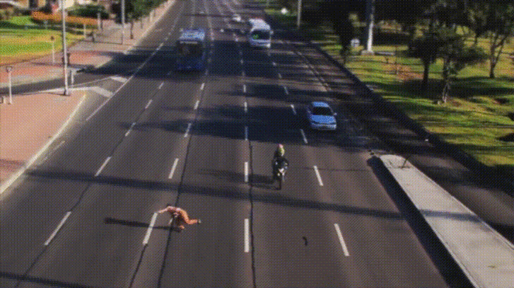 Một đoạn video quay lại một người đàn ông đã nhào lộn qua 5 làn đường trên đường cao tốc, nơi đang có nhiều phương tiện giao thông di chuyển, mà không hề hấn gì khi để chiếc xe chạy qua người mình ngay trên đường cao tốc, khiến làm cho nhiều người dựng tóc gáy.