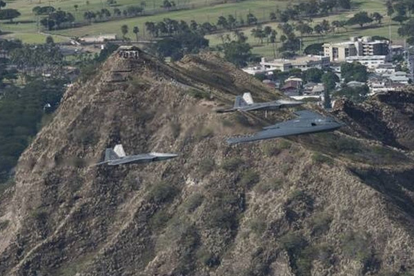 Máy bay ném bom B-2 và máy bay tiêm kích F-22 cùng với 200 phi công đă được triển khai đến căn cứ liên hợp Pearl Harbor-Hickam, Hawaii vào ngày 10/1/2019 để hỗ trợ lực lượng Đặc nhiệm ném bom thuộc Bộ chỉ huy Chiến lược Mỹ. Ảnh: Pacific Air Forces.