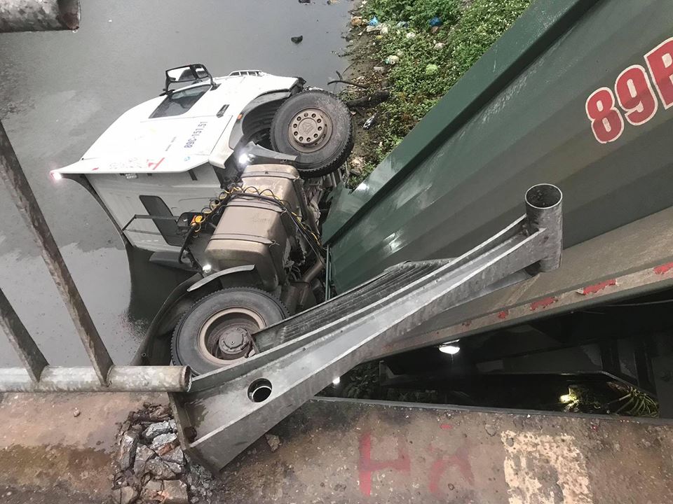 Tại hiện trường, phần đầu chiếc xe bị lật nghiêng dưới sông, phần đuôi vẫn ở trên thành cầu. Tài xế kịp thời thoát ra khoải cabin nên chỉ bị thương nhẹ.