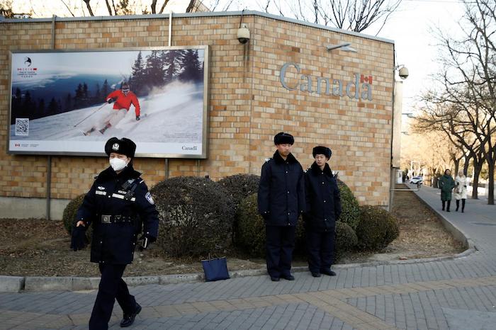 Cảnh sát theo dõi bên ngoài đại sứ quán Canada tại Bắc Kinh, Trung Quốc ngày 12/12/2018. (Ảnh: REUTERS/Thomas Peter)