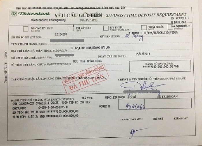 Theo tìm hiểu được biết, khách hàng N.T.T.H đến gửi tiền tiết kiệm tại Phòng Giao dịch Vĩnh Hoàng của Ngân hàng Vietcombank - Chi nhánh Chương Dương vào ngày 9/2/2017, trên giấy yêu cầu gửi tiền, nhân viên Ngân hàng nhận tiền gửi tiết kiệm đã ghi rõ 100.000.000 VNĐ và “Một trăm triệu đồng” tại mục “số tiền gửi bằng chữ”. Tại thẻ tiết kiệm có kỳ hạn số 04046466 phát hành ngày 9/2/2017 cho khách hàng N.T.T.H đều ghi cả bằng số và bằng chữ thể hiện số tiền gửi là 100.000.000 đồng. Để kiểm soát việc nhận tiền và ghi thông tin trên các tài liệu thì Ngân hàng thường bố trí bộ phận giám sát, đối soát, kế toán, thủ quỹ để kiểm soát số lượng tiền nhận có đúng, đủ không, có phù hợp với số tiền ghi trong các tài liệu không?