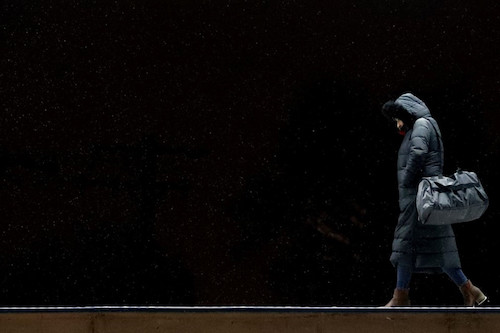 Người phụ nữ đi bộ giữa bão tuyết ở Quảng trường Thời đại ở New York. Cơ quan Khí hậu Quốc gia cho biết "một trong những đợt không khí lạnh nhất từ Bắc Cực trong lịch sử đang tràn xuống phía nam, đổ về miền Trung Tây trước khi lan rộng ra hai phần ba Bờ Đông nước Mỹ, với nhiệt độ hạ thấp đến mức kỷ lục và gió lạnh có thể gây chết người". Ảnh: Reuters.