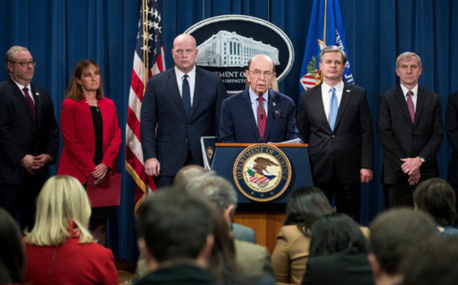 Bộ trưởng Thương mại Mỹ Wilbur Ross (giữa) công bố các cáo buộc nhằm vào Huawei hôm 28-1. Ảnh: The New York Times
