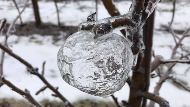 "Những cơn mưa lạnh sẽ khiến bất cứ thứ gì chúng chạm vào có thêm một lớp vỏ băng tinh khiết. Trong trường hợp này thì đó là những trái táo già chưa được thu hoạch", chuyên gia này nhận định.