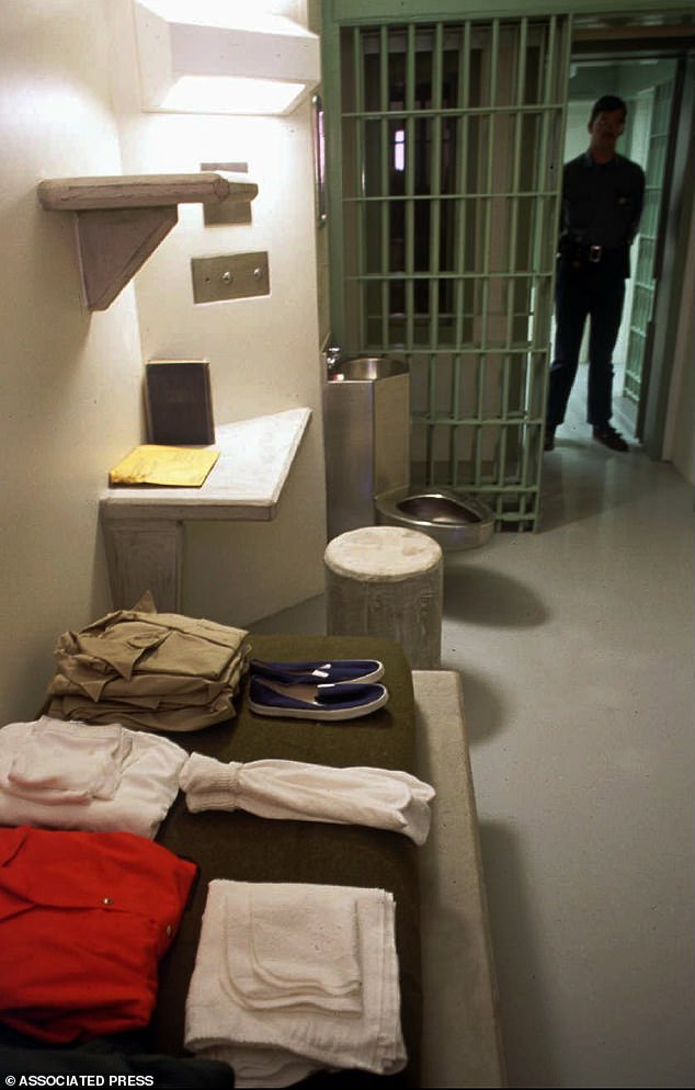 Giường trong phòng là một lớp bê tông với một tấm nệm và chăn mỏng, có nhà vệ sinh và bồn rửa ngay trong phòng giam.