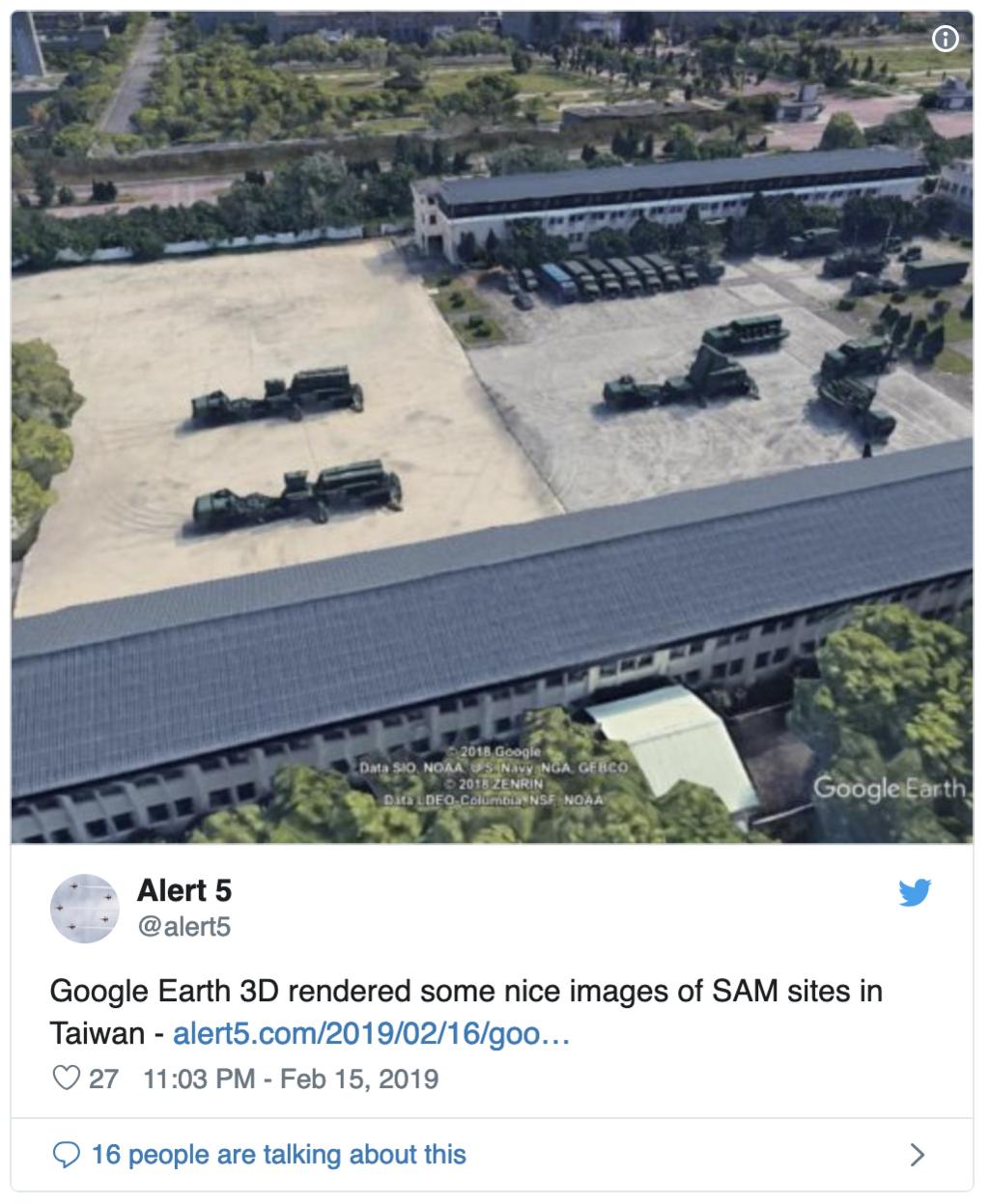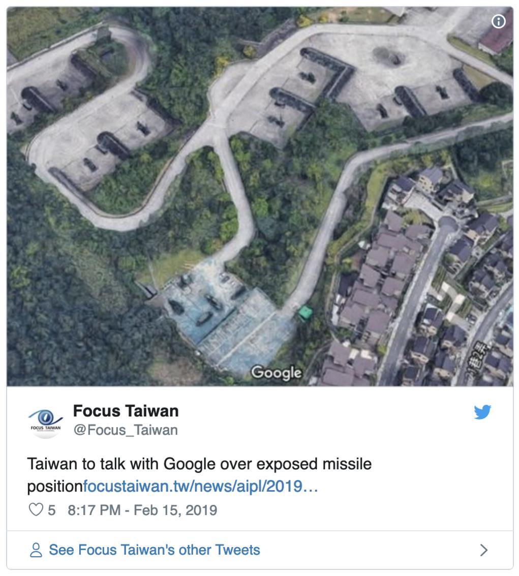 Google Maps tiết lộ hình ảnh bí mật quân sự của Đài Loan. Thật quá nguy hiểm. Hiện nay chính quyền Đài Loan đang kiểm soát thiệt hại sau khi bản nâng cấp Google Maps mới nhất tiết lộ các vị trí tên lửa nhạy cảm nhất của họ. Các quan chức của quốc phòng tại Đài Bắc đang yêu cầu Google làm mờ các vị trí tên lửa bị lộ chi tiết 3D trong bản nâng cấp mới nhất của ứng dụng bản đồ vệ tinh Google, đồng thời kêu gọi công chúng giữ bình tĩnh.