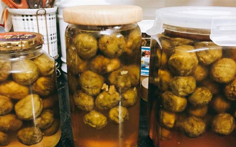 Sau 8-10 giờ khi đường đã tan, nước sấu đã tiết ra ngập quả thì vớt sấu vào lọ thủy tinh. Nước đường ngâm sấu đem đặt lên bếp đun lửa vừa, ngoáy cho tan hết đường còn lắng bên dưới. Khi nước đường sôi, bỏ 10g muối và gừng đập nhỏ vào đun sôi lại 1-2 phút là được. Để nước nguội đổ vào lọ sấu. Sau 2-3 hôm là có thể dùng pha nước uống. Sấu ngâm đường có thể để trong tủ lạnh suốt mùa.