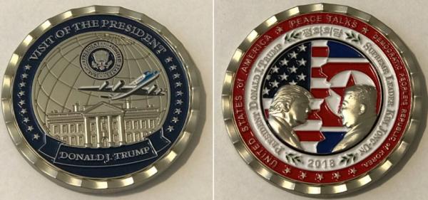 Đồng xu của Mỹ dành riêng cho hội nghị thượng đỉnh Mỹ - Triều có hình Tổng thống Donald Trump và nhà lãnh đạo Triều Tiên Kim Jong-un in 3D, trên nền quốc kỳ hai nước được in màu ở phía sau. Một đường răng cưa chạy qua trung tâm của đồng tiền đỏ - xanh - trắng gợi ý về đường viền của Khu phi quân sự Triều Tiên.
