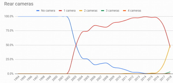 Nếu quan sát kỹ biểu đồ dưới đây, bạn sẽ thấy có một đường màu xanh bắt đầu vào năm 2017 và tăng dần lên vào năm 2018 - đó là đường đại diện cho các điện thoại với 3 camera sau. Con số này sẽ tăng lên trong năm nay, và ngày càng lớn hơn nữa.