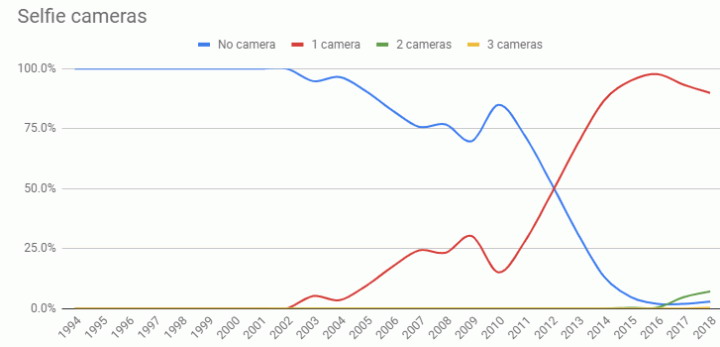 Nhìn kỹ hơn, bạn sẽ thấy có một đường màu xanh lá xuất hiện từ năm 2016, đại diện cho những chiếc điện thoại với camera selfie kép - một điểm nhấn mới trên biểu đồ đối xứng nhàm chán.