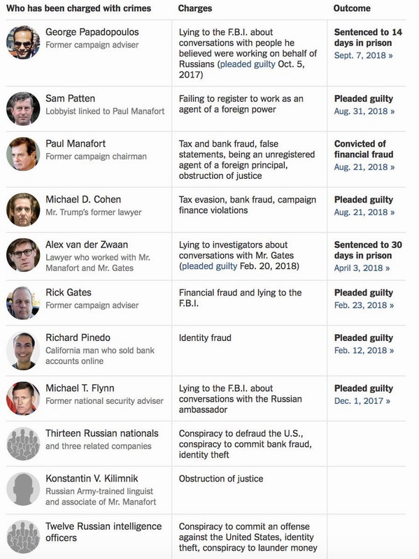 Cuối cùng, một người khác mà Mueller ban đầu điều tra, nhưng đã bàn giao Bộ Tư pháp: Sam Patten. Cho đến nay, không có cộng sự nào của Trump chịu nhận tội giúp Nga can thiệp vào cuộc bầu cử năm 2016. Tuy nhiên, năm người đã nhận tội với các tội ác khác nhau. Manafort và Gates bị buộc tội với một loạt các hành vi phạm tội liên quan đến công việc trước đây của họ đối với các chính trị gia Ukraine, trốn thuế và gian lận tài chính. Papadopoulos và Flynn đều thừa nhận đã khai báo gian dối với các nhà điều tra để che giấu liên lạc của họ với người Nga và Cohen thừa nhận đã đưa ra lời khai gian dối trước Quốc hội.