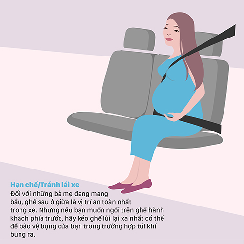 Người mang thai cần di chuyển ghế ngồi theo một khoảng cách thoải mái với bàn đạp ga, lý tưởng nhất là ngồi cách tay lái khoảng 250 mm để bảo vệ bụng bầu trong trường hợp túi khí bung ra khi xảy ra tai nạn.
