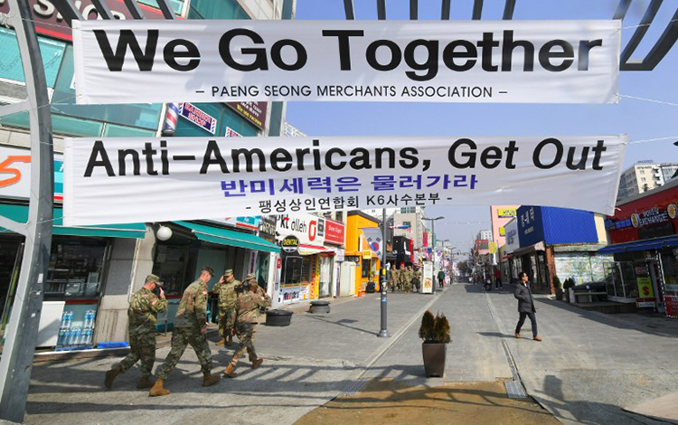 Lính Mỹ đi qua khu mua sắm, ăn uống bên ngoài Trại Humphreys ở thành phố Pyeongtaek. Ảnh: AFP