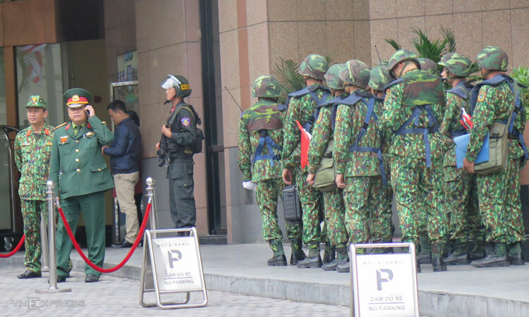 Phía ngoài khách sạn, cảnh sát cơ động đặc nhiệm cũng chia làm nhiều nhóm, mỗi nhóm hơn 10 người trực ở các hướng khác nhau. Những cảnh sát này được trang bị áo chống đạn, súng AK, chó nghiệp vụ.