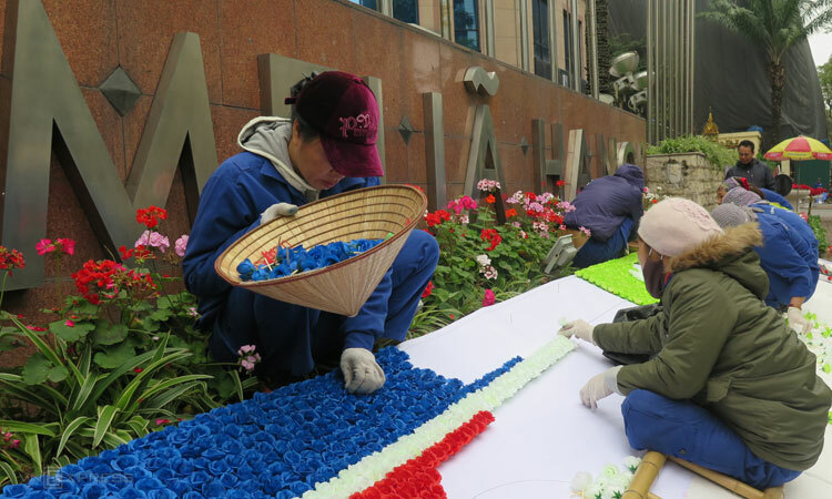 Các công nhân đang cắm hoa tạo hình quốc kỳ hai nước Việt Triều. Ảnh: Việt Dũng.