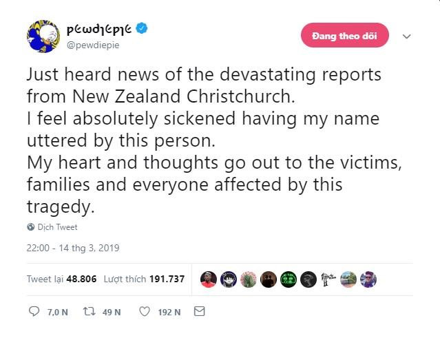 Điều này khiến Felix Kjellberg phải lập tức lên tiếng. Anh cho biết mình "hoàn toàn suy sụp khi tên mình được thốt ra từ miệng những người này", và hiện giờ tâm trí anh chỉ hướng tới những nạn nhân và gia đình của họ.