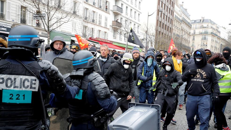 Người biểu t́nh xem đợt xuống đường lần này tại Paris là "tối hậu thư" để Tổng thống Macron đáp ứng các yêu sách về phúc lợi xă hội và b́nh đẳng kinh tế. Nhiều nhà quan sát lo ngại phong trào sẽ chuyển hướng bạo lực mạnh mẽ hơn trong các tuần kế tiếp, tương tự như giai đoạn đầu tiên của phong trào "áo khoác vàng". Ảnh: AFP.