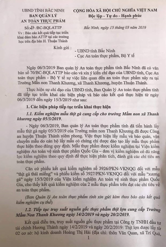 Sáng 18/3, bà Nguyễn Thanh Bình - Phó trưởng Ban Quản lý ATTP tỉnh Bắc Ninh cho biết: Ban đã nhận được kết quả kiểm nghiệm đối với mẫu thịt gà thái miếng và xương gà được lấy tại trường Mầm non Thanh Khương do Viện Kiểm nghiệm An toàn vệ sinh thực phẩm Quốc gia cung cấp.